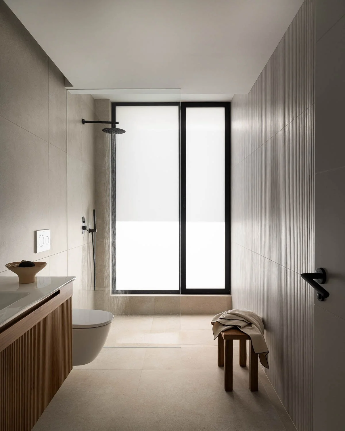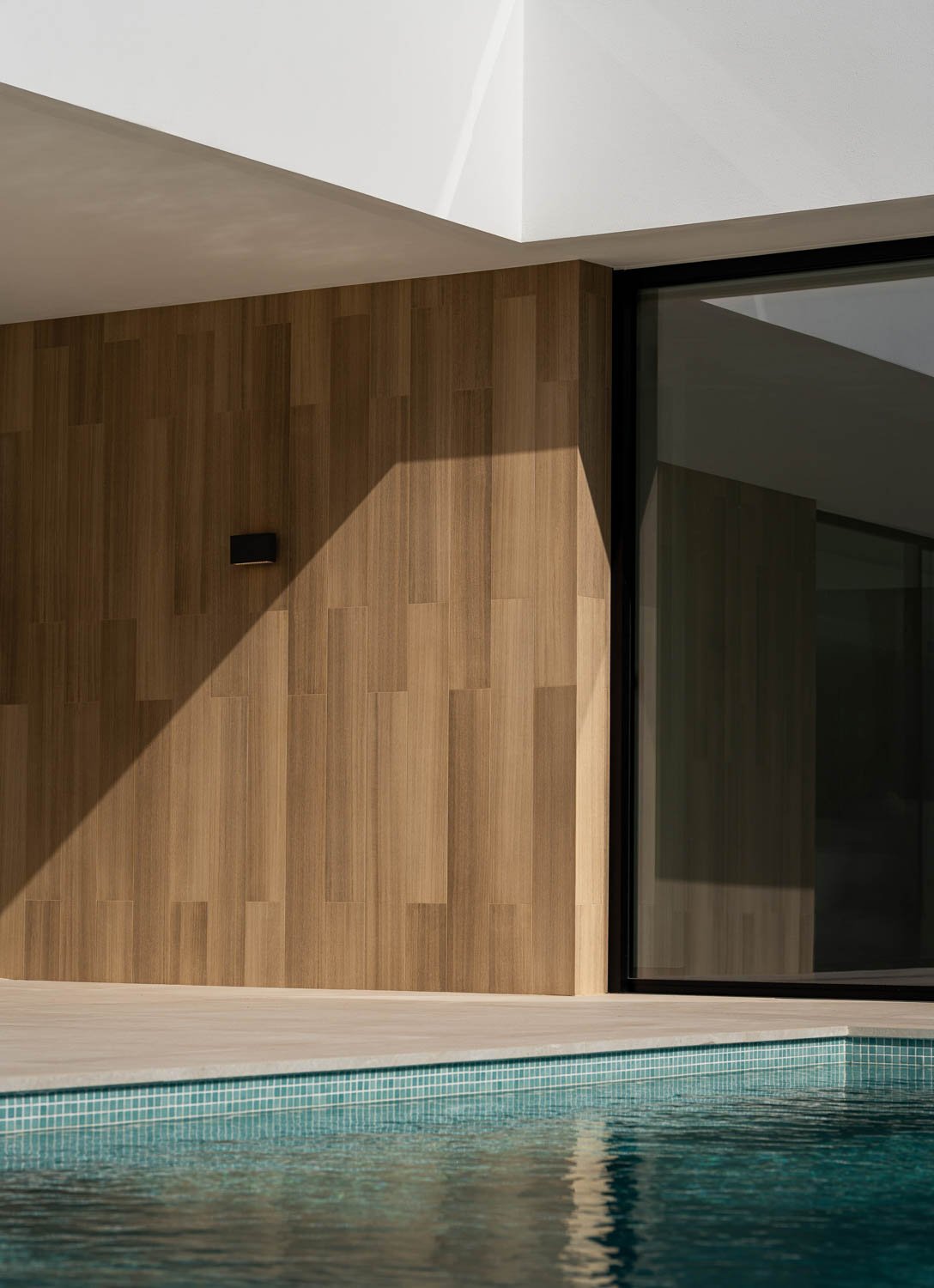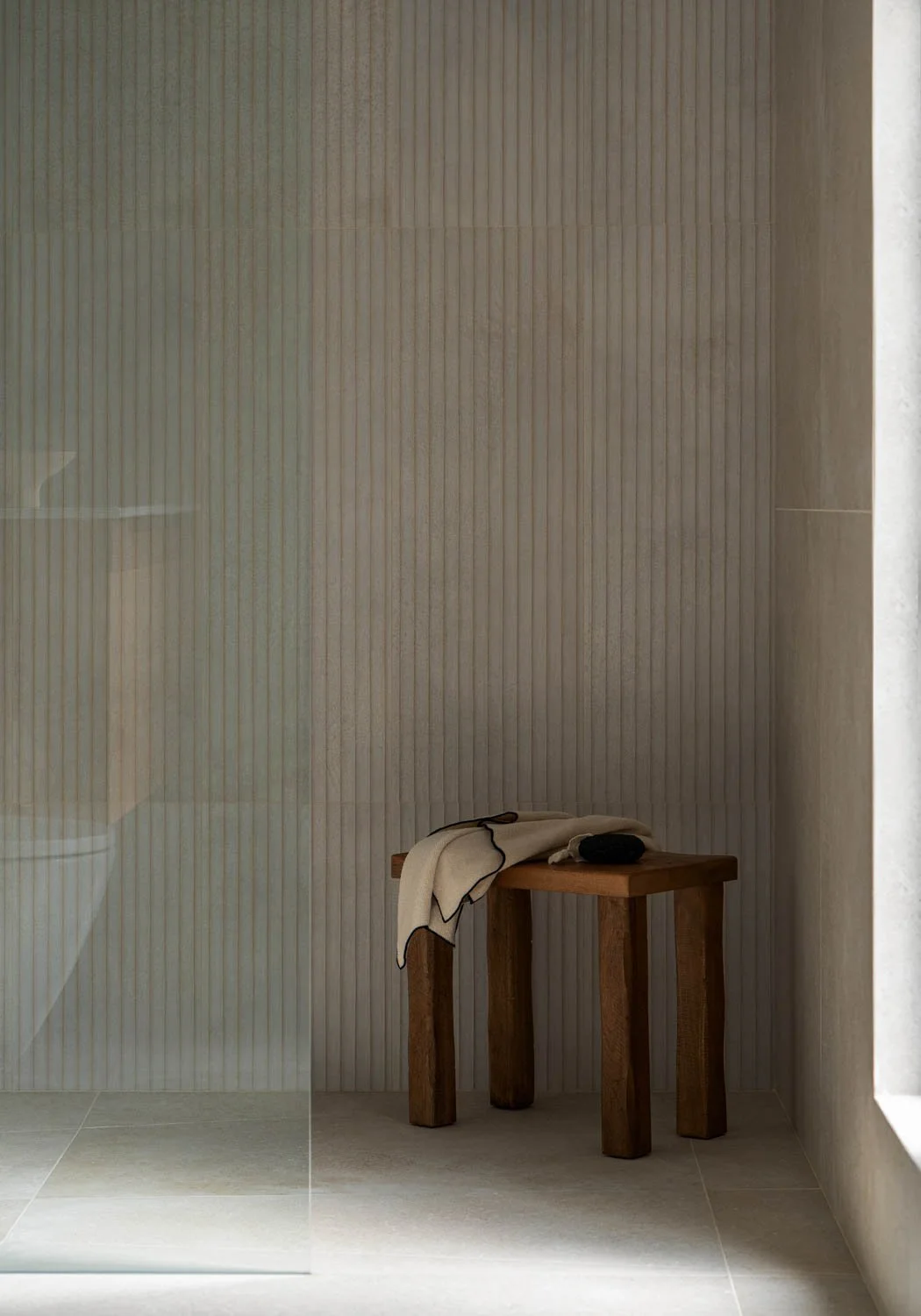 To address the emptiness of the space, we adopted a strategy of tight framing and close-up shots. Instead of wide, vacant angles, the lens focused on the dialogue between materials: the junction of stone and wood or the ribbed tiles in the bathrooms. To manage the harsh sun, it was crucial to avoid direct reflections to bring out the matte and satin finishes. We used natural light and shadows to "furnish" the interior. The interplay of light and shadow on the walls and floors provided the depth and texture that the space lacked due to the absence of furniture.