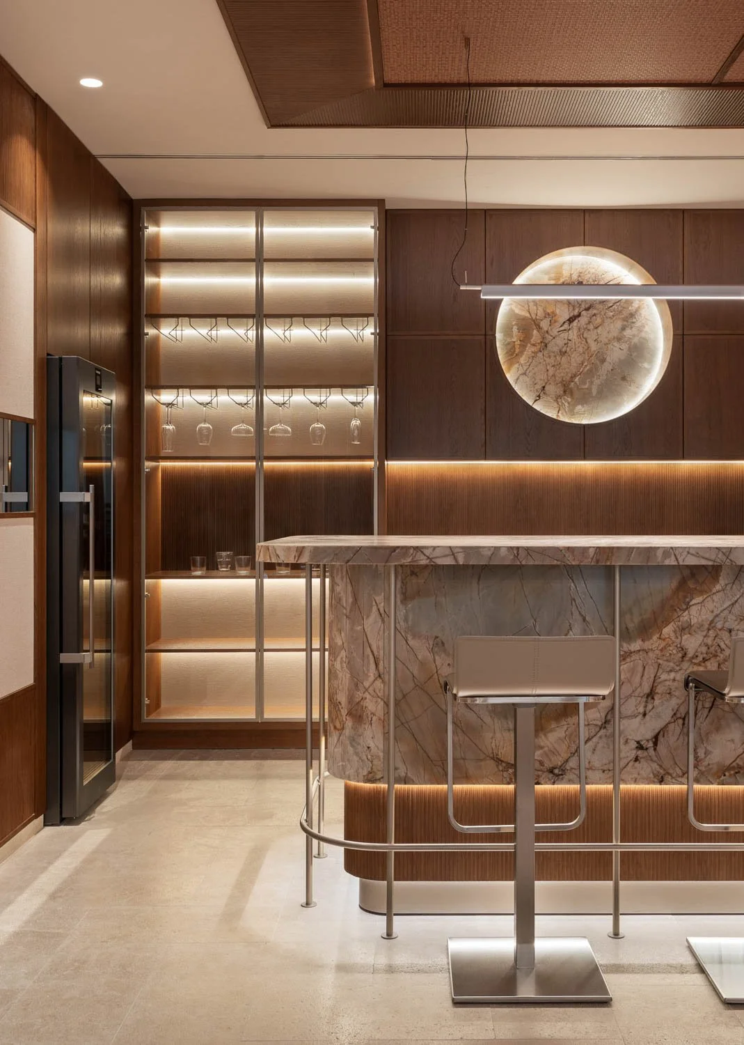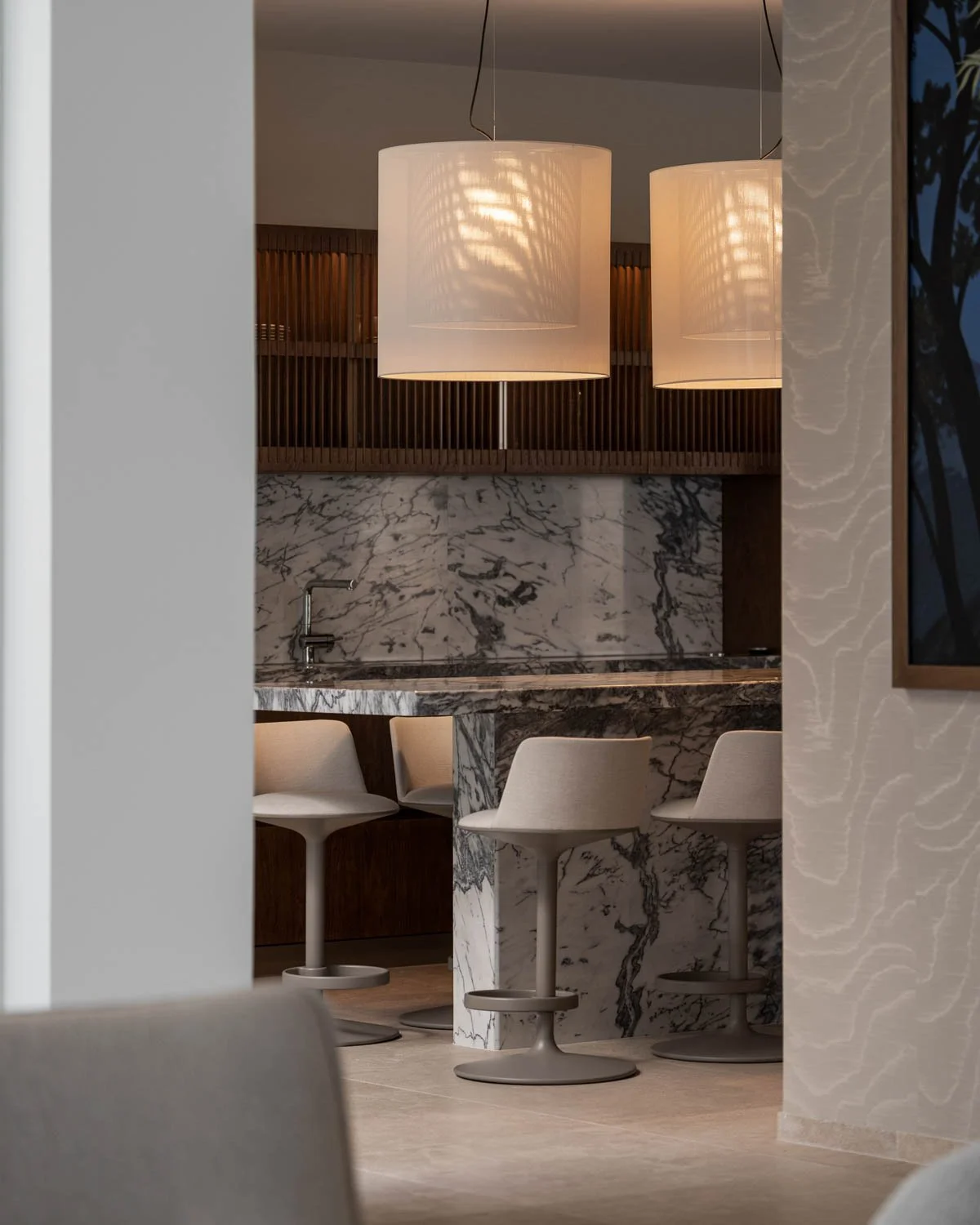 To manage the time pressure, we implemented a rigorous selection of frames, focusing on key sightlines and the details that define the home’s style, such as the cabinetry and stone. For the dark bar area in the basement, I adjusted the technical approach. Rather than fighting the lack of windows, we utilized the existing architectural lighting, LEDs and stone backlighting to build a moody, club-like atmosphere. This allowed us to convey the luxury character while maintaining the authenticity of the original lighting design.
