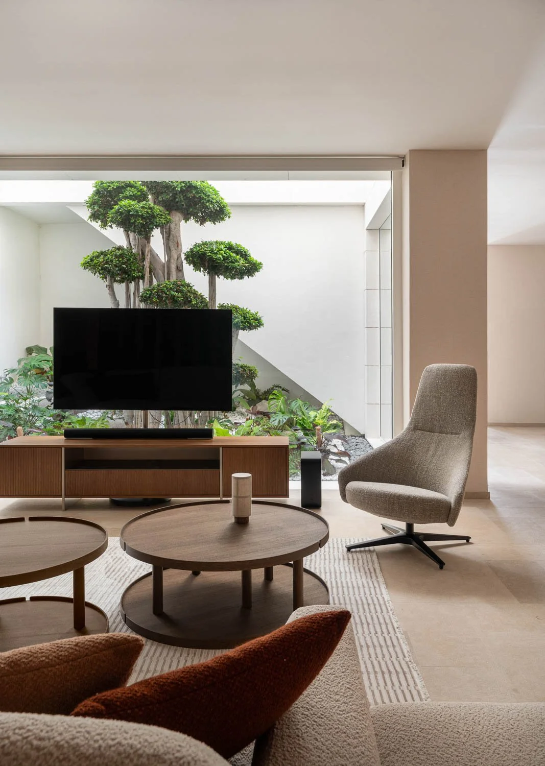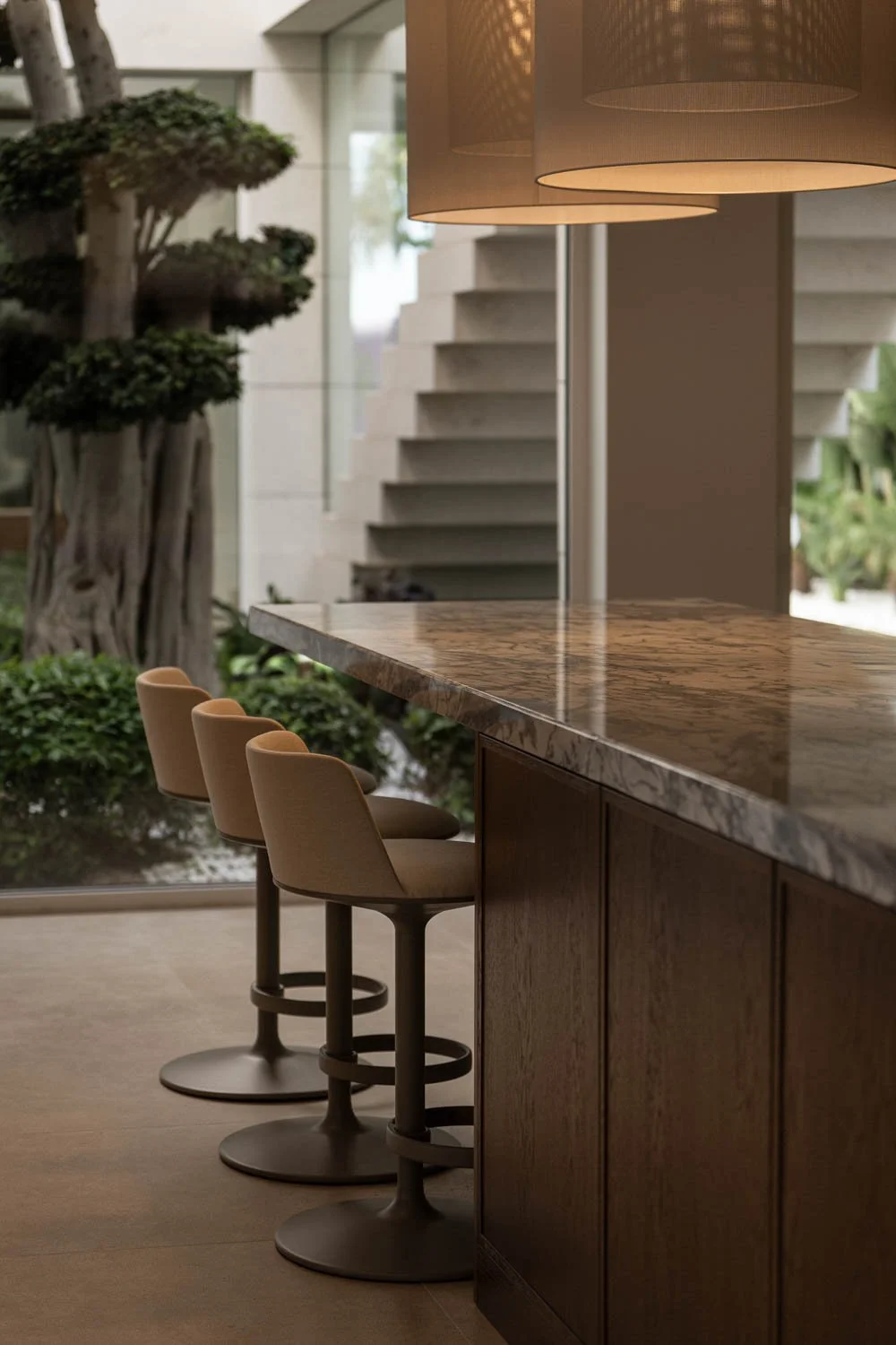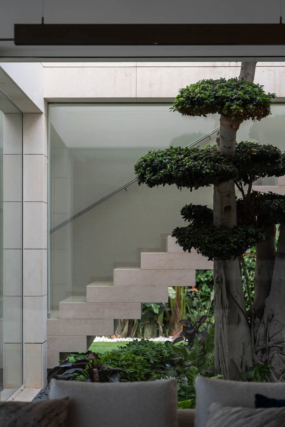 A comprehensive photoshoot of a luxury villa located in Benahavís. The interior design is inspired by the moiré effect, a subtle interplay of light and reflections created by expansive glass surfaces, gently permeating the different areas of the home. At the heart of the residence lies a glass atrium featuring bonsai trees, bringing nature indoors, while the lower level houses an exclusive entertainment zone.